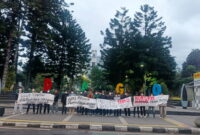 Bandung, Mahasiswa yang tergabung dalam Poros Mahasiswa Bandung Bergerak (PMBB) melakukan aksi unjuk rasa di Taman Dago Cikapayang Kota Bandung Jumat, 27 Februari 2026,…