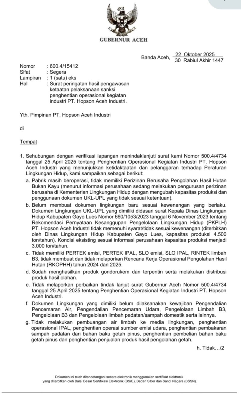 Banda Aceh,24 Nopember 2025|-Gubernur Aceh Tertanggal 22 Oktober 2025 dengan nomor surat sebagai berikut 600.4/15412 :Segera Lampiran : 1 (satu) eks Hal : Surat peringatan hasil pengawasan ketaatan pelaksanaan sanksi penghentian operasional kegiatan industri PT. Hopson Aceh Industri.